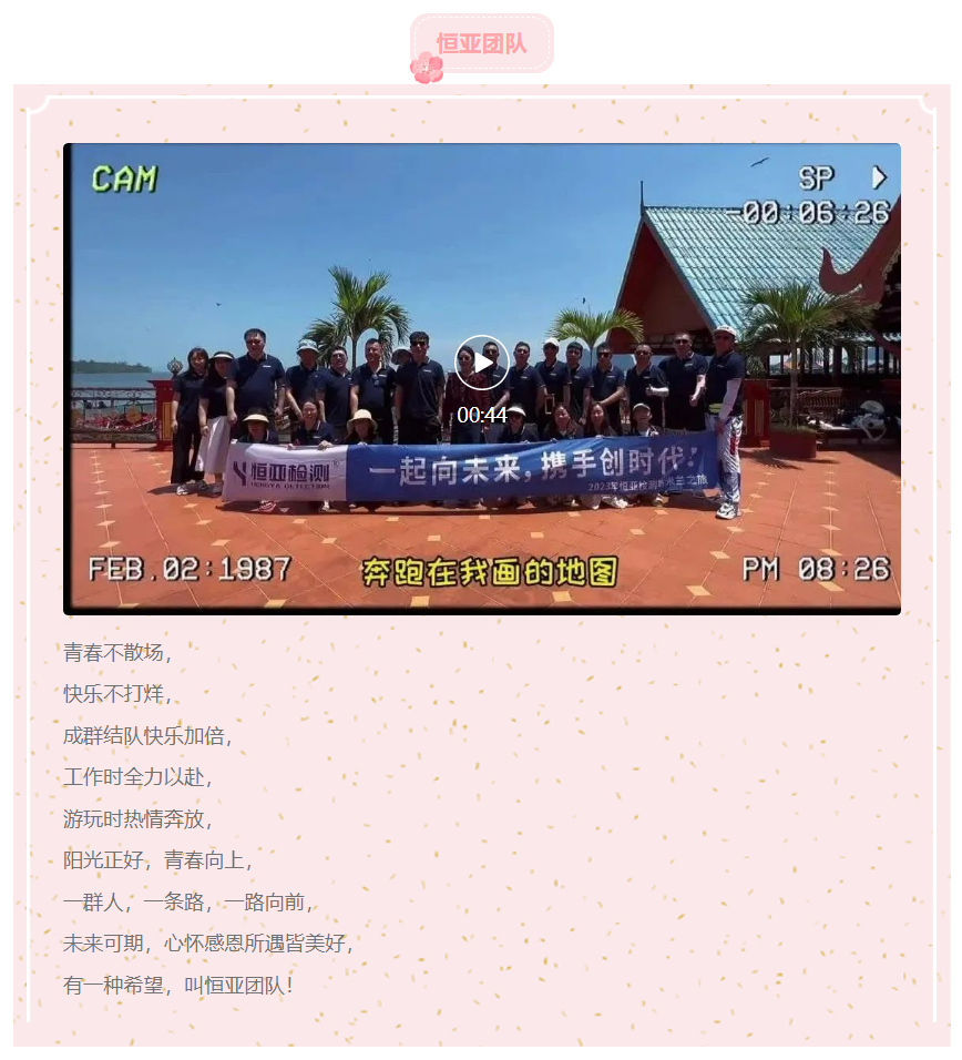 青春不散場, 快樂不打烊, 成群結(jié)隊(duì)快樂加倍, 工作時(shí)全力以赴, 游玩時(shí)熱情奔放, 陽光正好,青春向上, 一群人,一條路,一路向前, 未來可期,心懷感恩所遇皆美好, 有一種希望,叫恒亞團(tuán)隊(duì)!