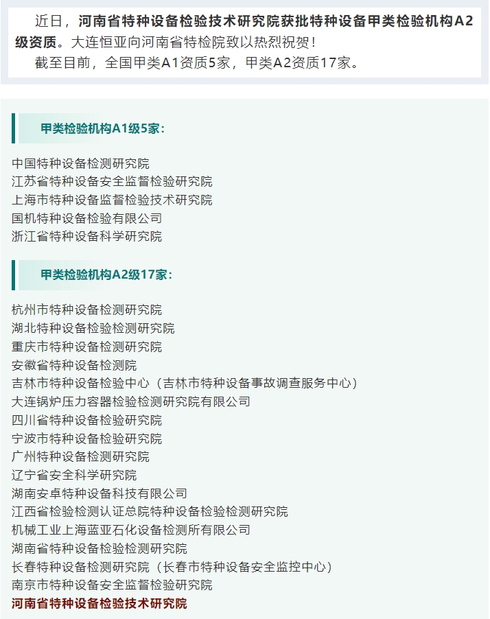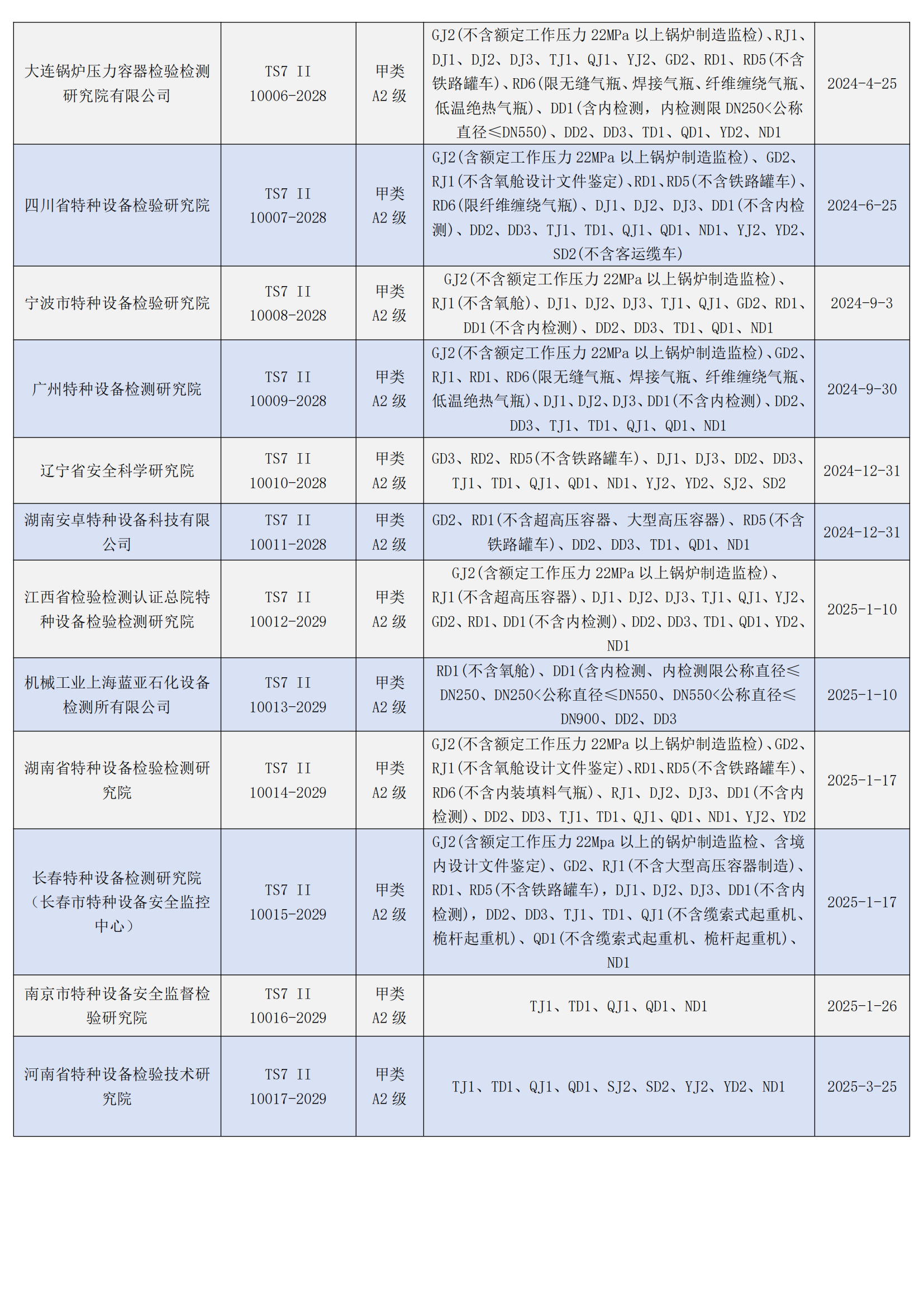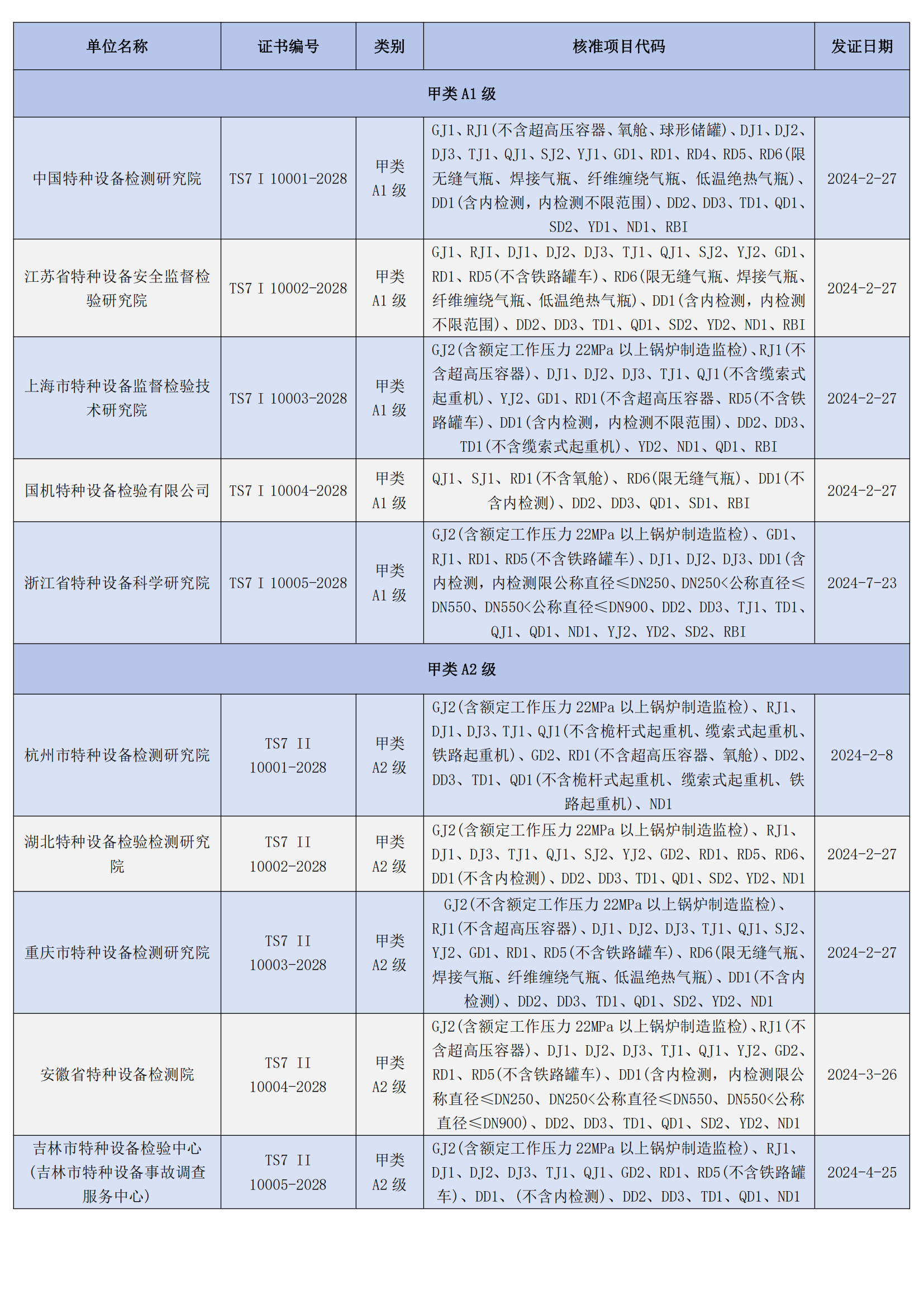 全國甲類A1和A2級特檢機構名錄及核準項目